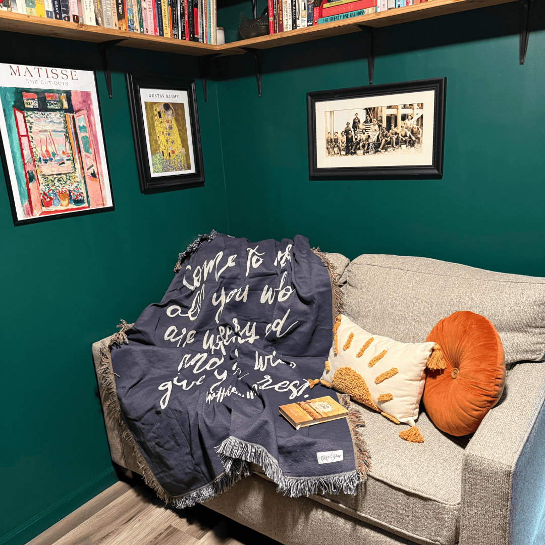 Wrap yourself in peace and encouragement with our Come to Me Woven Blanket. Featuring a rich deep blue background with bold white lettering, this cozy throw is a daily reminder of the comforting words of Matthew 11:28: