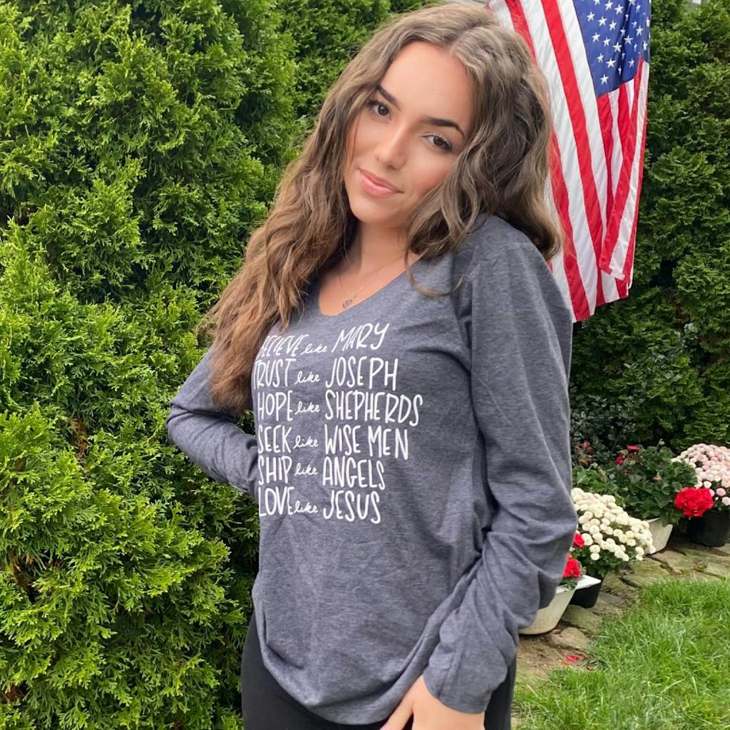 "I ordered from EllyandGrace for the first time in early November. I was so impressed with the shirt quality and workmanship, I ordered two more times! The shirts are so soft and just the right thickness, not the practically see-through fabric many t-shirts are these days. There are so many choices in messages. My shirts have been helpful in starting faith based conversations. I love that!" - Angela